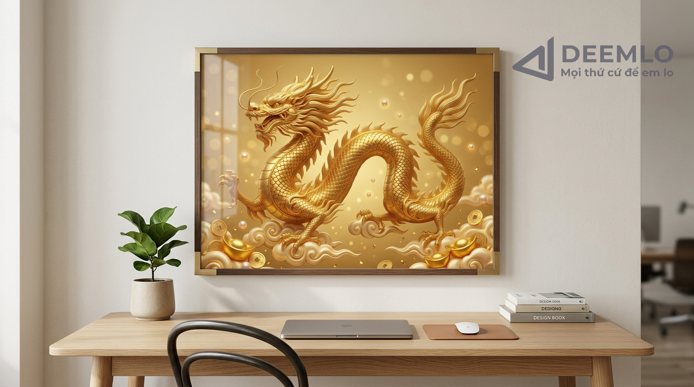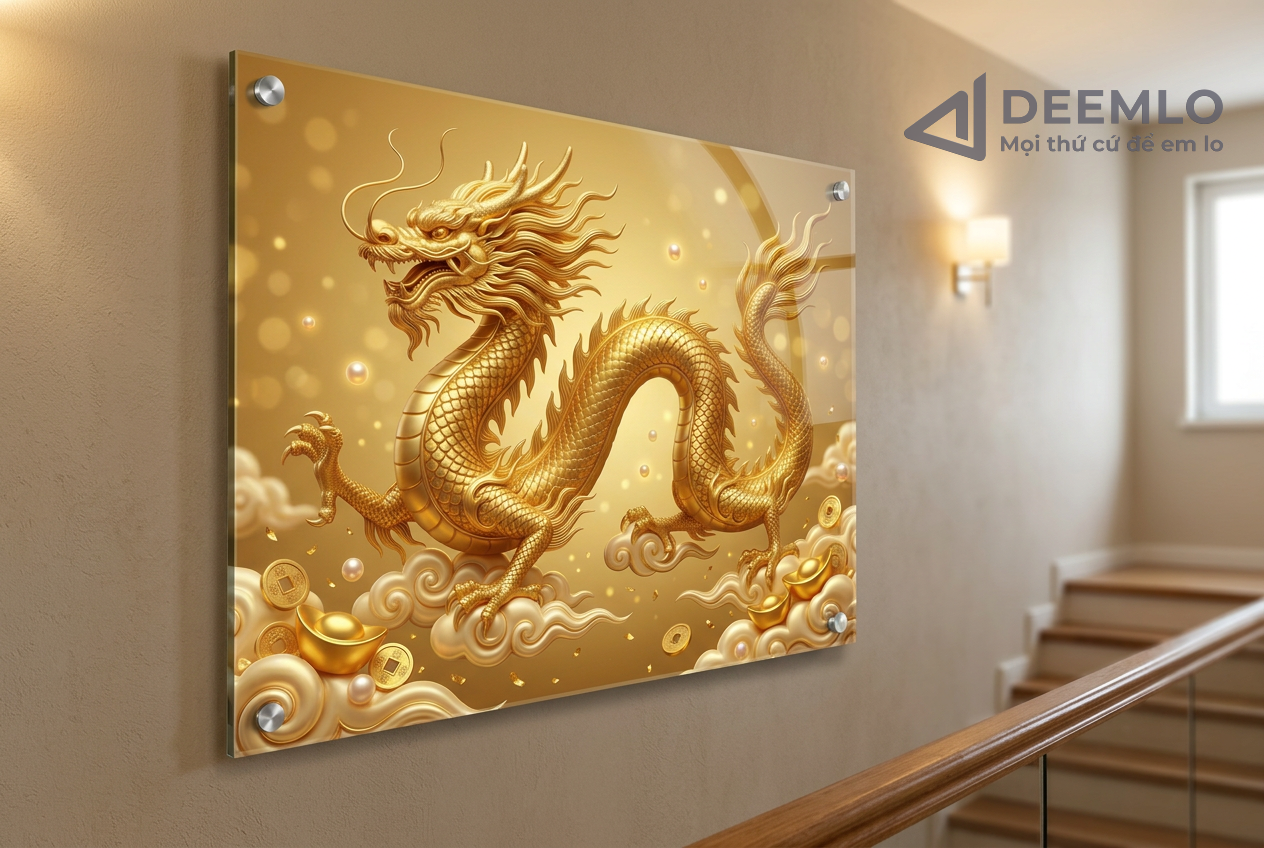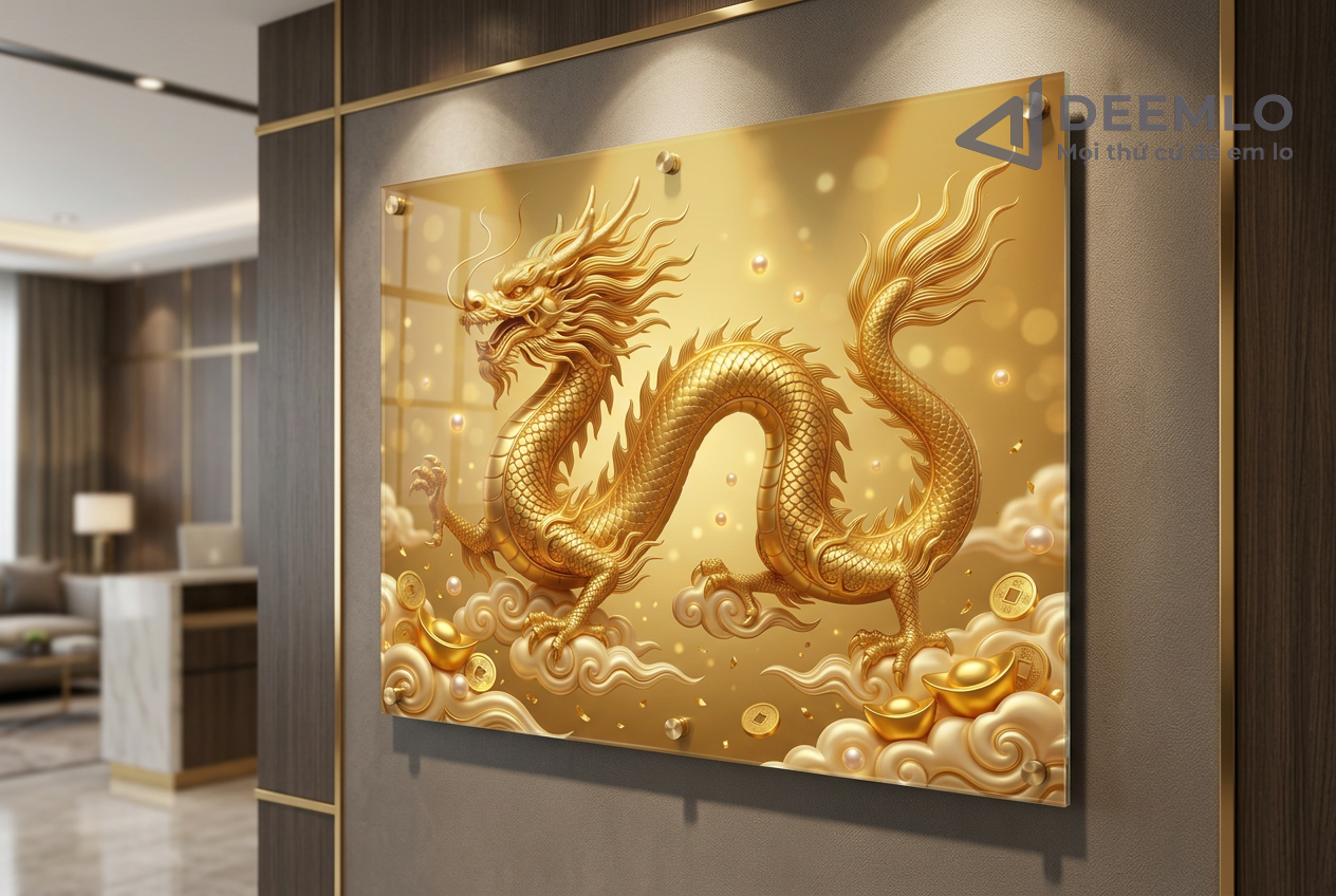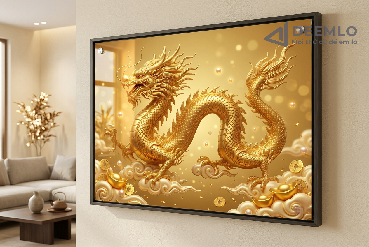 Nghệ thuật: Hình ảnh rồng vàng uy nghi giữa tầng mây, kết hợp cùng các chi tiết đồng tiền và thỏi vàng mang lại tài lộc.